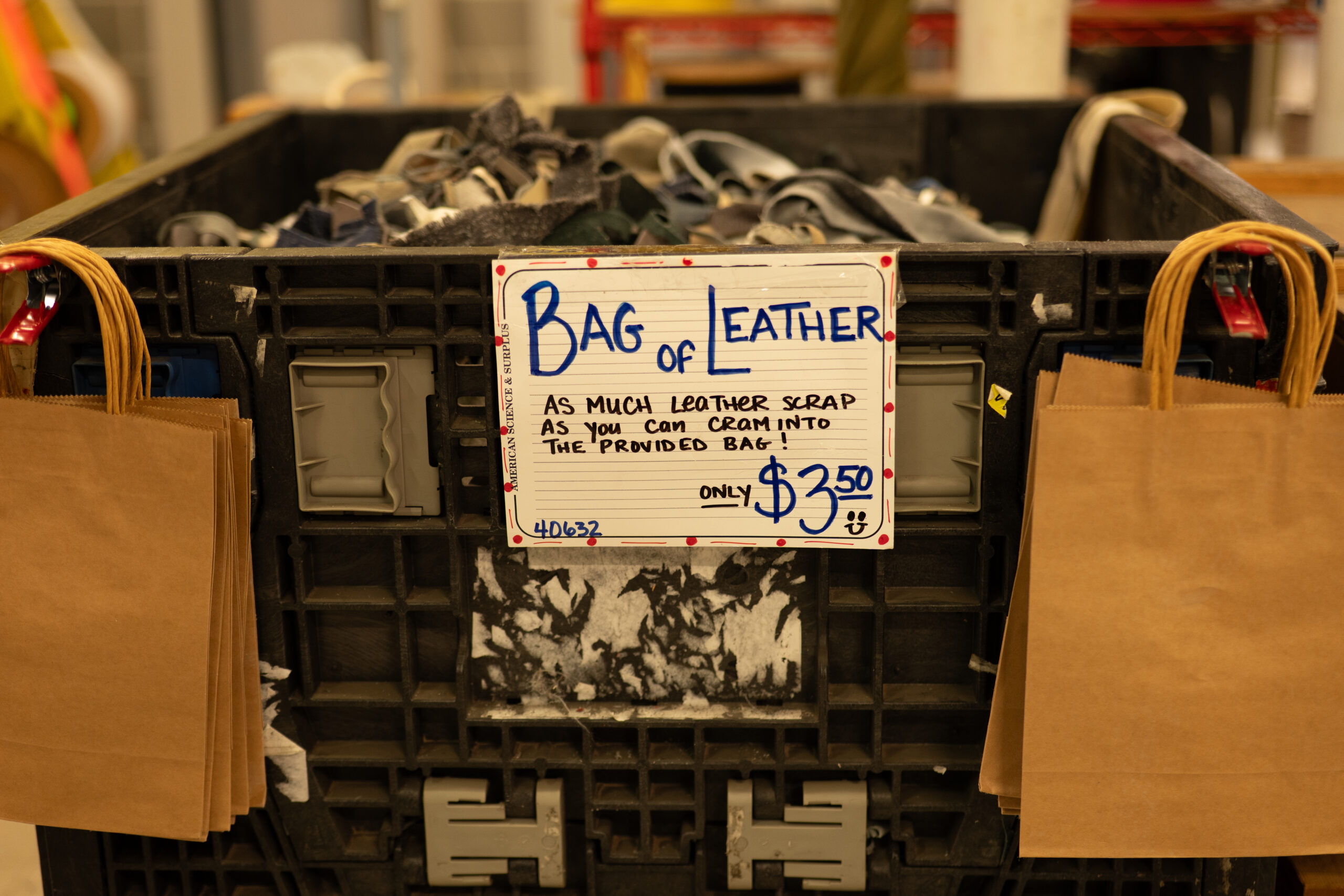 A: One thing I really want the public to know is that we want their surplus. I do not just want to buy from vendors. I want to buy from the public too, because there are so many usable materials, parts, and scraps out there that still have value and can still be used. I get leather scraps from people, and those cutoffs are still useful to someone. We have also had things like foam and cigar boxes come through, and those are the kinds of items people love finding here because they can turn them into something else. We want your surplus, we are looking for volume of course, if you were going to throw it out anyway, this is a good place instead, people can use it, and at least this way it won’t go into landfill.